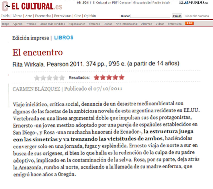 Presentada en la FIL de Guadalajara (diciembre de 2011), la publicación de El encuentro es en especial oportuna a la luz de los 18 mil millones de dólares de multa impuestos a la Chevron- Texaco, quien se ha comprometido a luchar contra la decisión de los tribunales “hasta que el infierno se congele”. Mientras tanto, los residentes del noroeste del Ecuador siguen enfrentando los efectos de los casi mil vertederos abiertos repletos de tóxicos que envenenan el agua potable y el ambiente.”El encuentro” describe los orígenes de este crimen mientras teje las historias de los dos jóvenes protagonistas y sus respectivas búsquedas de identidad cultural e individual.